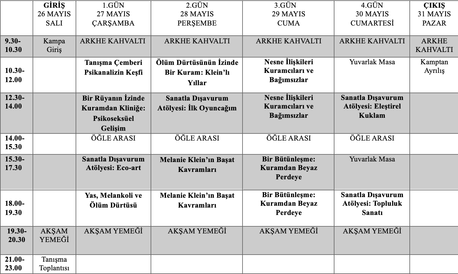 Bu kuramsal izleğe eşlik eden sanat temelli atölyeler, psikanalitik kavramlar ve nesne ilişkileri hakkında bilgi edinme ve düşünceyle bir birikim oluşturma sürecinde olan katılımcılara, yaşantısal düzeyde sanatın psikanalizle el ele gideceği, çeşitli sanat malzemeleriyle sanatın içtekini, bazen söze gelmeyen, bazen de farkındalığın derinleşebileceği yerleri farklı yönergeler ile keşfetme imkânı sağlaması adına düşünülmüştür. Katılımcılar, bireysel ve kolektif üretim süreçleri aracılığıyla içsel temsillerini sembolik bir zeminde deneyimleme fırsatı bulabileceklerdir. Görsel, bedensel ve yazılı ifade biçimleri; iç nesne dünyası, erken ilişki örüntüleri ve grup alanıyla kurulan temasın farklı katmanlarını görünür kılarak teorik ve deneyimsel bir süreç birlikteliği yaşanması planlanmıştır. Böylece kamp, kuramsal derinliği yaratıcı deneyimle buluşturan bütünlüklü bir öğrenme alanı sunacaktır.